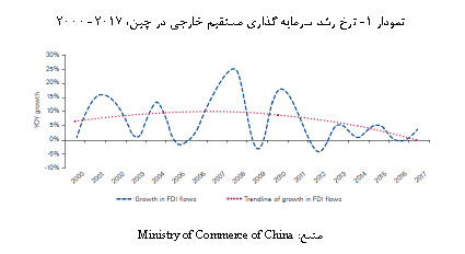 چین در سال های گذشته با کاهش قابل توجه جریان سرمایه گذاری مستقیم خارجی مواجه شده است (نمودار 1)، به طوری که نرخ رشد سرمایه گذاری مستقیم خارجی در چین در سال 2016 و چندین ماه در سال 2017 به زیر صفر رسیده است.