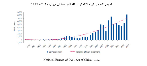 با این وجود، به دلیل اقتصاد بسیار بزرگ چین، حفظ نرخ رشد «متوسط رو به بالا» می تواند انگیزه کافی برای سرمایه گذاران خارجی فراهم کند. نه تنها نرخ رشد تولید ناخالص داخلی چین یکی از بالاترین نرخ رشدها در جهان است، بلکه با یک اقتصادی که ارزش آن بیش از 80 تریلیون یوان (11.84 تریلیون دلار آمریکا) است ، هر یک صدم درصد از رشدی که چین در حال حاضر تجربه می کند از نظر ارزش معادل با 1.5 صدم درصد رشدی است که در پنج سال پیش تجربه کرده و یا معادل 2.5 صدم درصد رشدی است که ده سال پیش داشته است. برای اینکه این ارقام را بتوانیم بهتر توضیح دهیم فرض کنید که 6.9 درصد رشدی که چین در سال 2017 تجربه کرده است ، باعث می شود که تولید ناخالص داخلی این کشور به 8 تریلیون یوان (1.18 تریلیون دلار آمریکا) باشد (نمودار 2)، که این رقم بسیار بزرگتر از کل تولید ناخالص داخلی کشوری مثل ترکیه است.