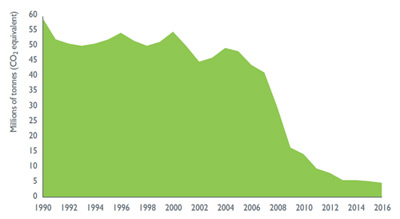 همانطور که در نمودار 5 نشان داده شده است، میزان تولید گازهای گلخانه ای به ازای هر واحد مصرف انرژی در فاصله زمانی بین سال های 1991 تا 2016 در حدود 50.6 درصد کاهش یافته است. شدت تولید گازهای گلخانه ای –یعنی میزان انتشار گازهای گلخانه ای به ازای هر واحد تولید- از سال 1990 تا سال 2016 به میزان 77.9 درصد کاهش یافته است.