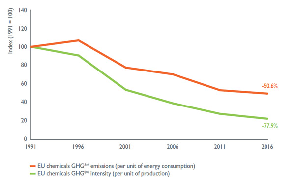 این مهم به لطف تلاش آگاهانه صنعت پتروشیمی در جهت توسعه فناوری های پاک، و بالاتر از آن افزایش کارایی انرژی به دست آمده است. صنعت پتروشیمی علاوه بر افزایش کارایی انرژی فرآیندهای خود و نوآوری در این صنعت همچنین به افزایش کارایی انرژی در مصرف کنندگان صنایع پایین دستی محصولات خود کمک کرده است.