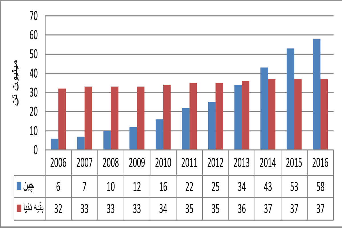 نمودار2- مقایسه تقاضای متانول چین با بقیه دنیا (تن؛2016-2006)