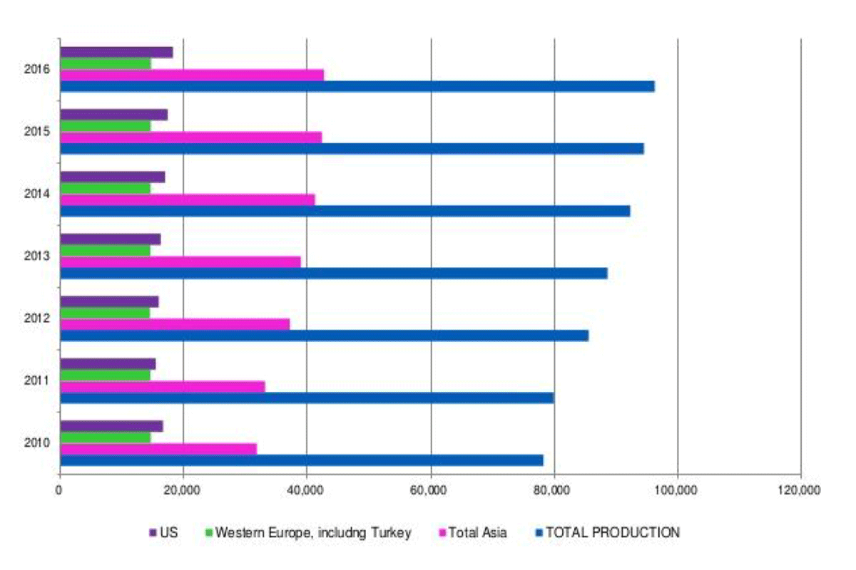 نمودار 3- تولید پروپیلن در بخشهای مختلف جهان (هزار تن؛ 2016-2010)