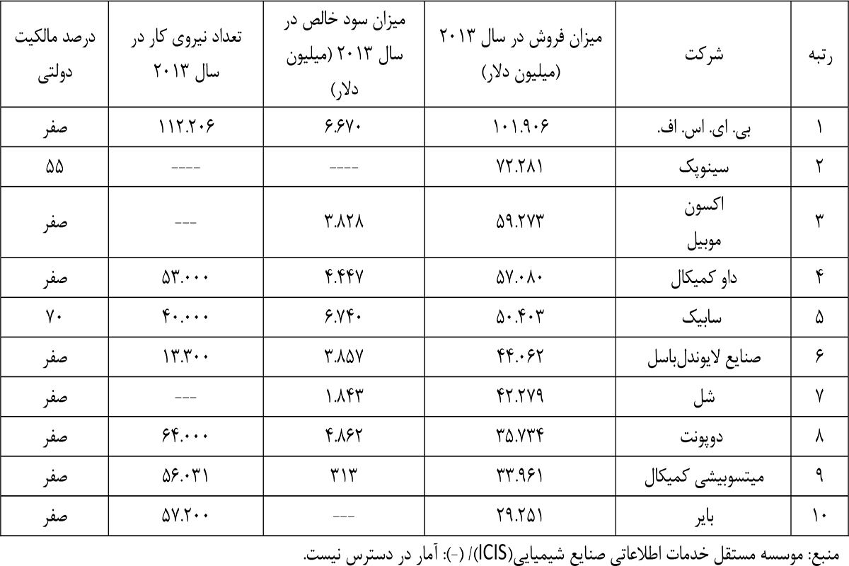 جدول 1- وضعیت ده شرکت بزرگ صنعت پتروشیمی جهان(طبقه بندی موسسه [3]ICIS)