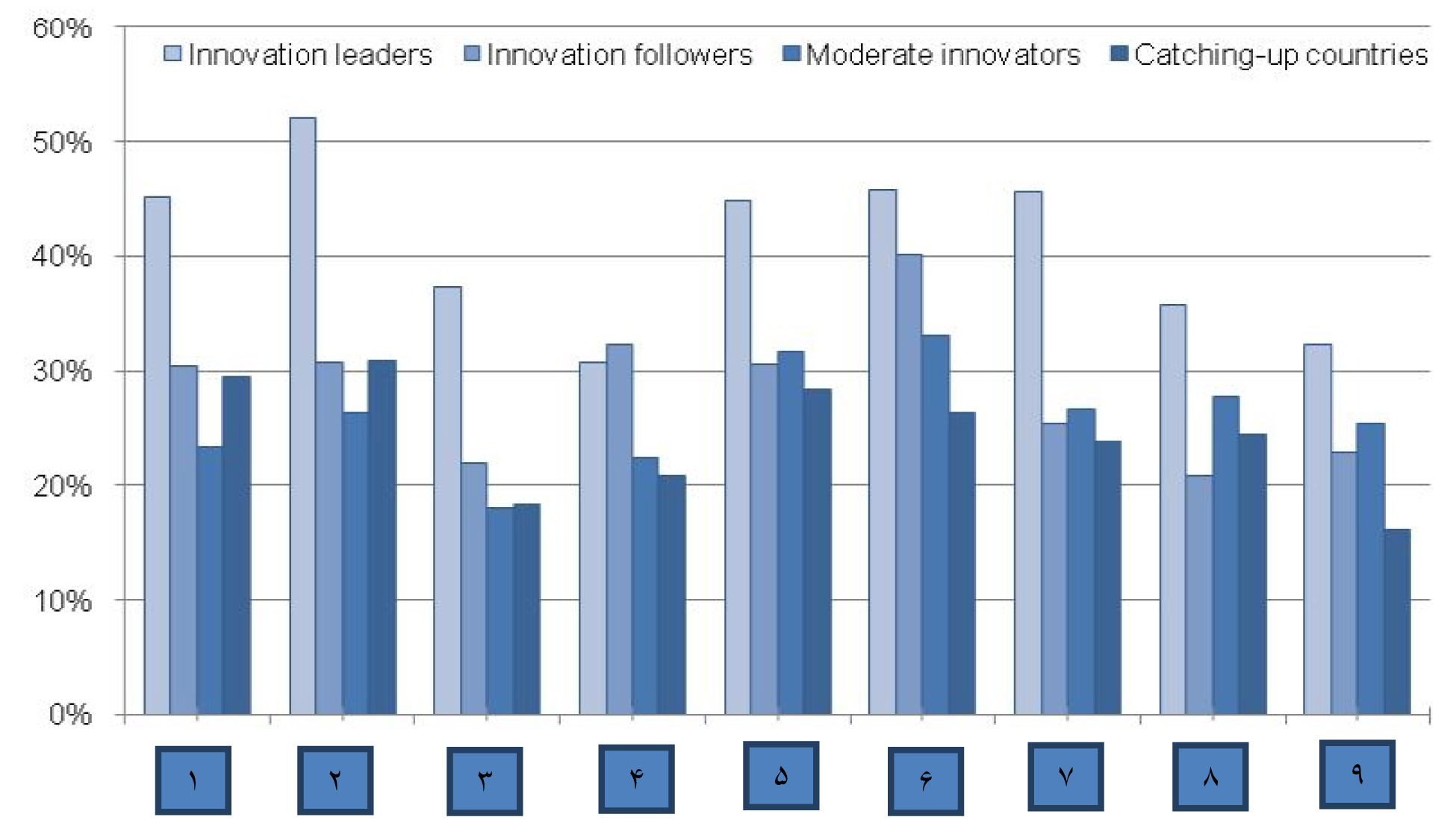 در نمودار 1 محور عمودی درصد سازمانهای نوآور را نشان میدهند که منافع حاصل از نوآوری را گزارش کردهاند. محور افقی نیز نوع منفعتی را نشان میدهد که سازمان گزارش دهنده تجربه کرده است. این منافع با شمارههای یک تا نه نشان داده شده است و توضیح هر یک از این منافع به شرح زیر است.