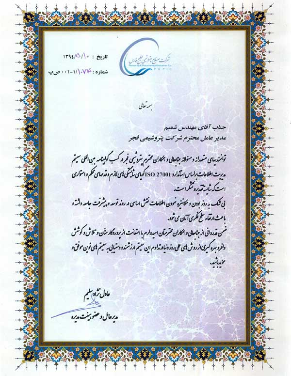 به گزارش روابط عمومی شرکت پتروشیمی فجر، براساس ممیزی صورت گرفته از این شرکت در تیرماه امسال، این شرکت به عنوان یکی از شرکتهای پیشرو در صنعت نفت،گاز و پتروشیمی کشور موفق به کسب گواهینامه ملی ISO27001:2013 شد.