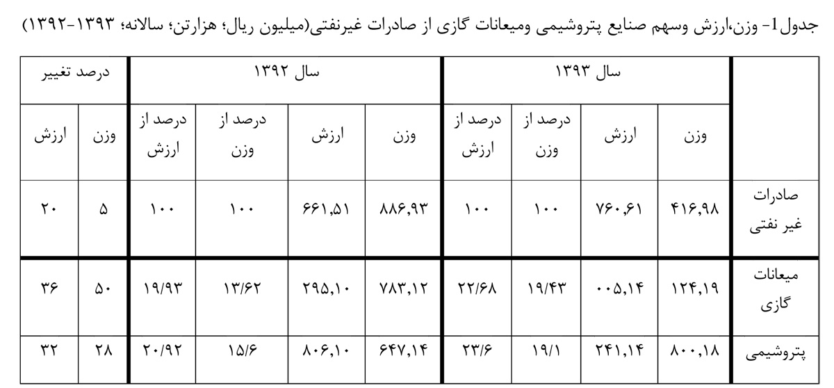 در واقع سرمایهگذاری در کشور باید در حوزههایی اتفاق بیفتد که مزیت نسبی بالاتری نسبت به دیگر حوزهها در آن وجود دارد و هماکنون این مزیت در حوزههای نفت، گاز و پتروشیمی بیش از دیگر قسمتها بوده و مزیت کشور در امکان تامین خوراک برای مدتهای طولانی، نیروی انسانی متخصص، مصرف در حال رشد، دسترسی به بنادر و بازارهای فروش برای صنعت پتروشیمی، این صنعت را به یکی از ارزآورترین بخشها در اقتصاد ایران تبدیل ساخته است و مسلما یکی از راه گریز برای کاهش خامفروشی منابع زیرزمینی به شمار میآید. در حال حاضر بیش از نیمی از ارزش و 40 درصد از وزن صادرات غیرنفتی کشور را میعانات گازی و محصولات پتروشیمی تشکیل میدهد (جدول 1) که این امر خود نشاندهنده اهمیت سرمایهگذاری در این حوزههاست. نمودار 1 ترکیب صادرات غیرنفتی ایران را در سال 1393 نشان میدهد. در این سال بخش پتروشیمی با صادراتی بالغ بر 14.241 میلیون ریال حدود 23 درصد از کل صادرات غیر نفتی ما را تشکیل دادهاست.همچنین ارزش صادرات این محصول در سال 1393 نسبت به سال قبل نیز 32 درصد رشد داشته است و به نظر میرسد این روند در سال 1394 نیز محفوظ مانده است. بنابراین با استناد به مطالب پیشگفته توسعه صنایع بالادستی نفت و صنایع وابسته پالایشگاهی و پتروشیمی، نیازمند توجه ویژهای است.