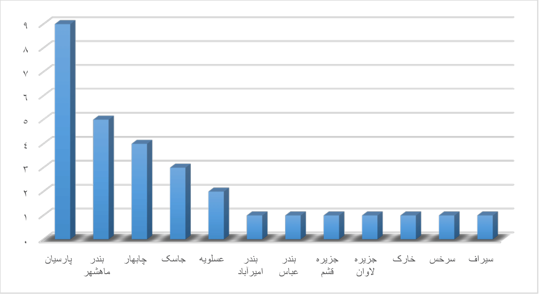 نمودار 2 تعداد فرصتهای جدید سرمایهگذاری به تفکیک محل اجرا را نشان میدهد. در این بین منطقه ویژه اقتصادی پارسیان با 9 فرصت جدید، میزبان بیشترین فرصتهای سرمایهگذاری در صنعت پتروشیمی خواهد بود. همچنین بندر ماهشهر با 5 پروژه، چابهار با 4، بندر جاسک 3 و عسلویه با 2 فرصت سرمایه گذاری در جایگاههای بعدی قرار دارند.جزیره خارک،بندر سیراف، جزیره قشم، جزیره لاوان، بندرعباس، بندر امیرآباد و سرخس نیز هر کدام با یک فرصت سرمایهگذاری جدید مواجهاند.