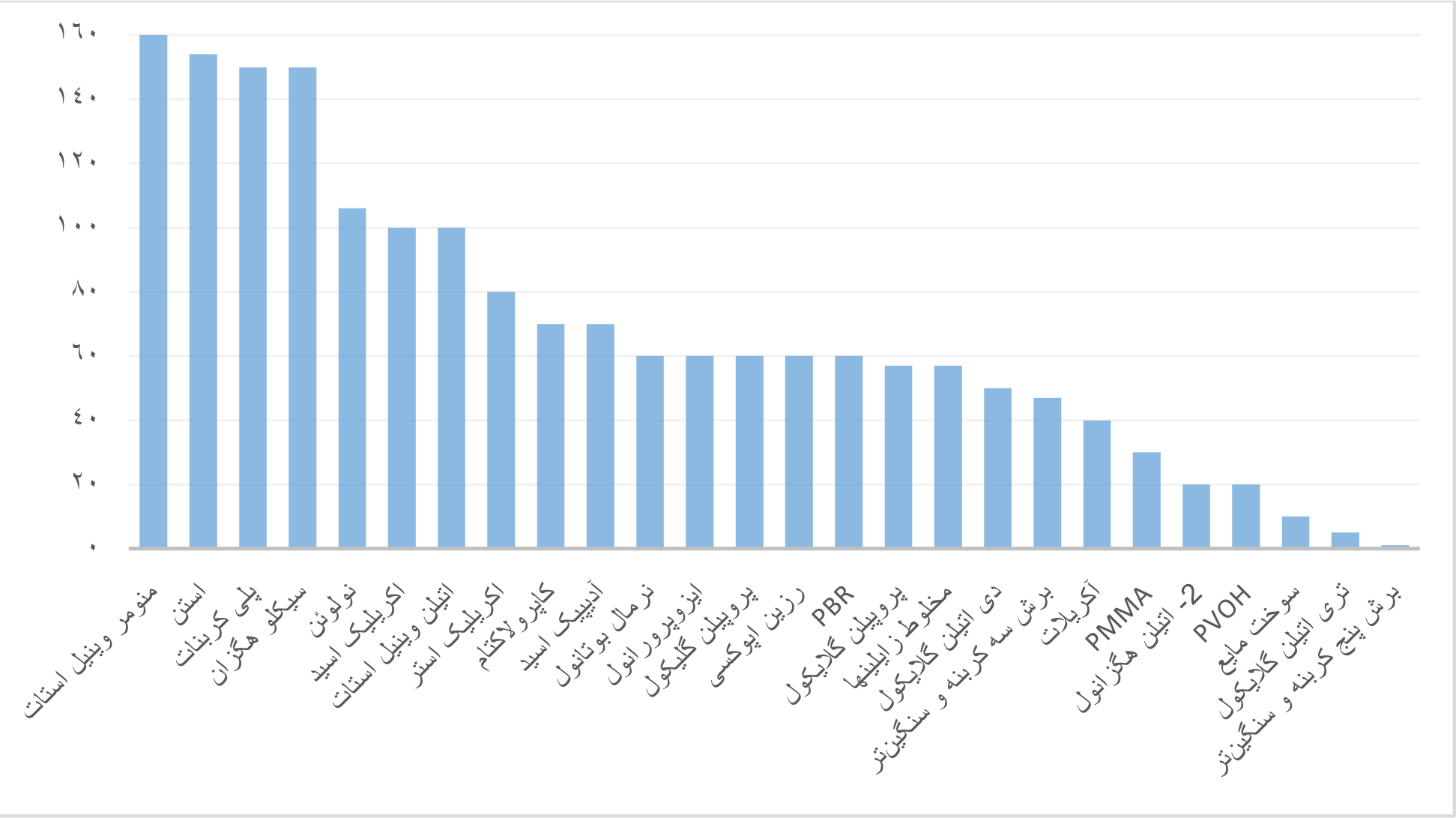 | 30 | VAM/EVA/PVOH | پارسیان | منومر وینیل استات | 160 | اتیلن | 150 | 632 | 5,625 |