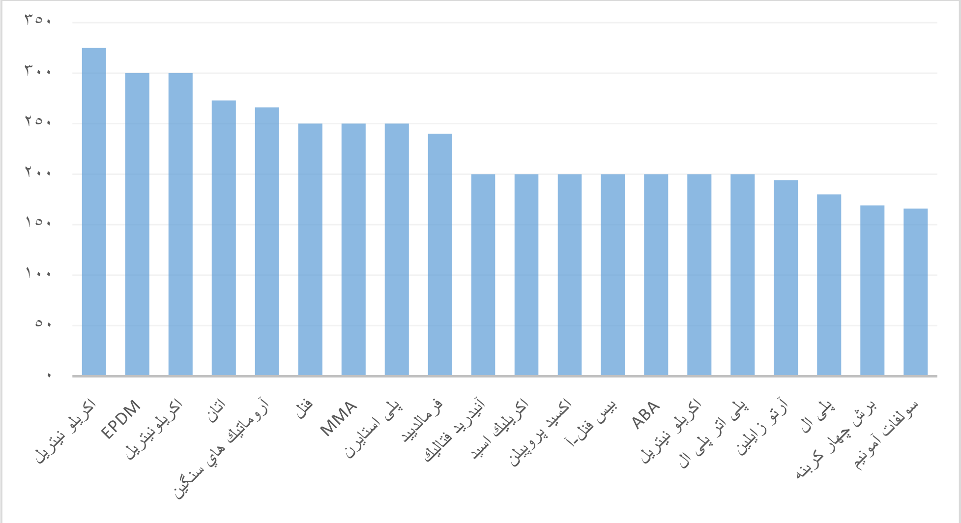 | 9 | VAM /EVA/PVOH | پارسیان | منومر وینیل استات | 160 | اتیلن | 150 | 632 | 5,625 |