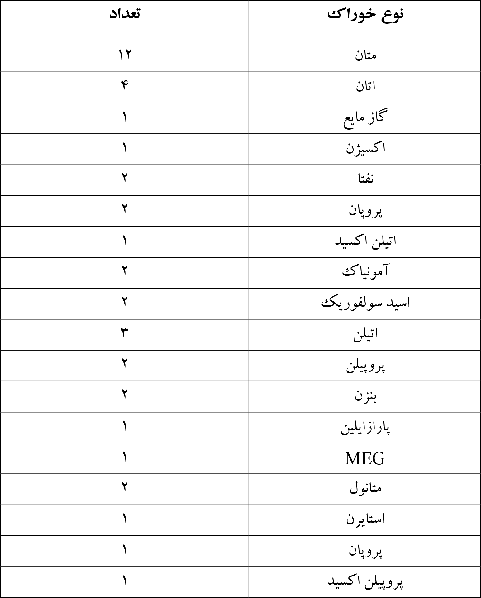 | 24 | اکریلو نیتریل | ماهشهر | اکریلو نیتریل | 200 | پروپان | 340 | 310 | 2,558 |
