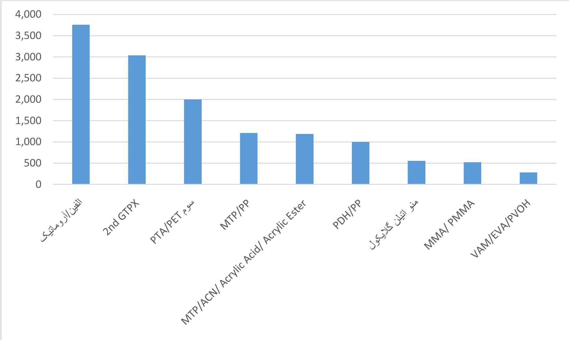 نمودار 3 تا 5مجموع حجم تولیدی هر یک از محصولات پتروشیمی تولید شده توسط این طرحها را نشان میدهد. همانطور که مشاهده میشود، متانول با حجم تولید 13.500هزار تن در سال بیشترین سهم را در بین تولید محصولات پتروشیمی دارد. پروپیلن، پلی پروپیلن، اتیلن، دی متیل اتر نیز به ترتیب با حجم تولید 5.300، 3.830، 2.800 و 1650 هزار تن در سال در رتبههای بعدی قرار دارند.