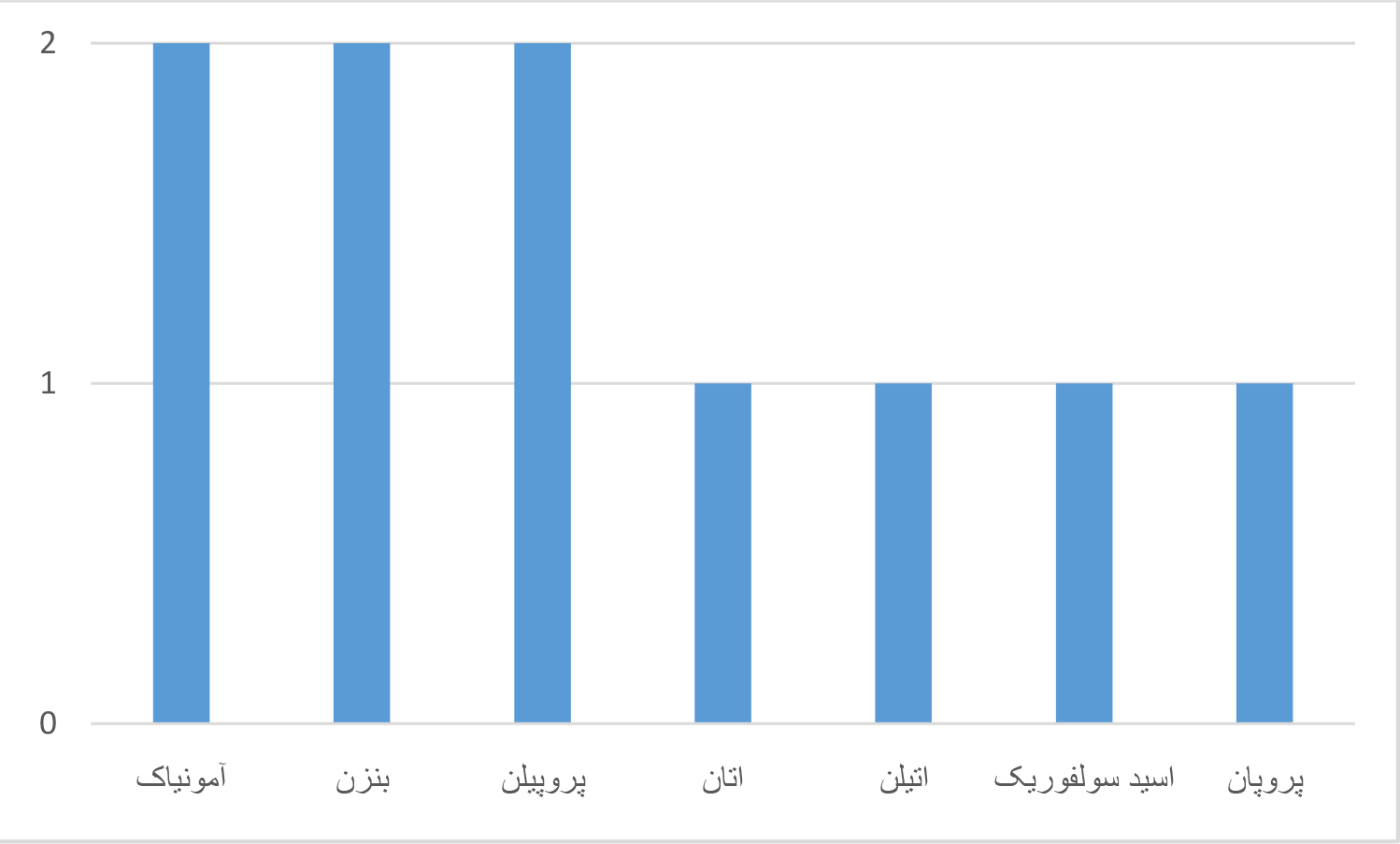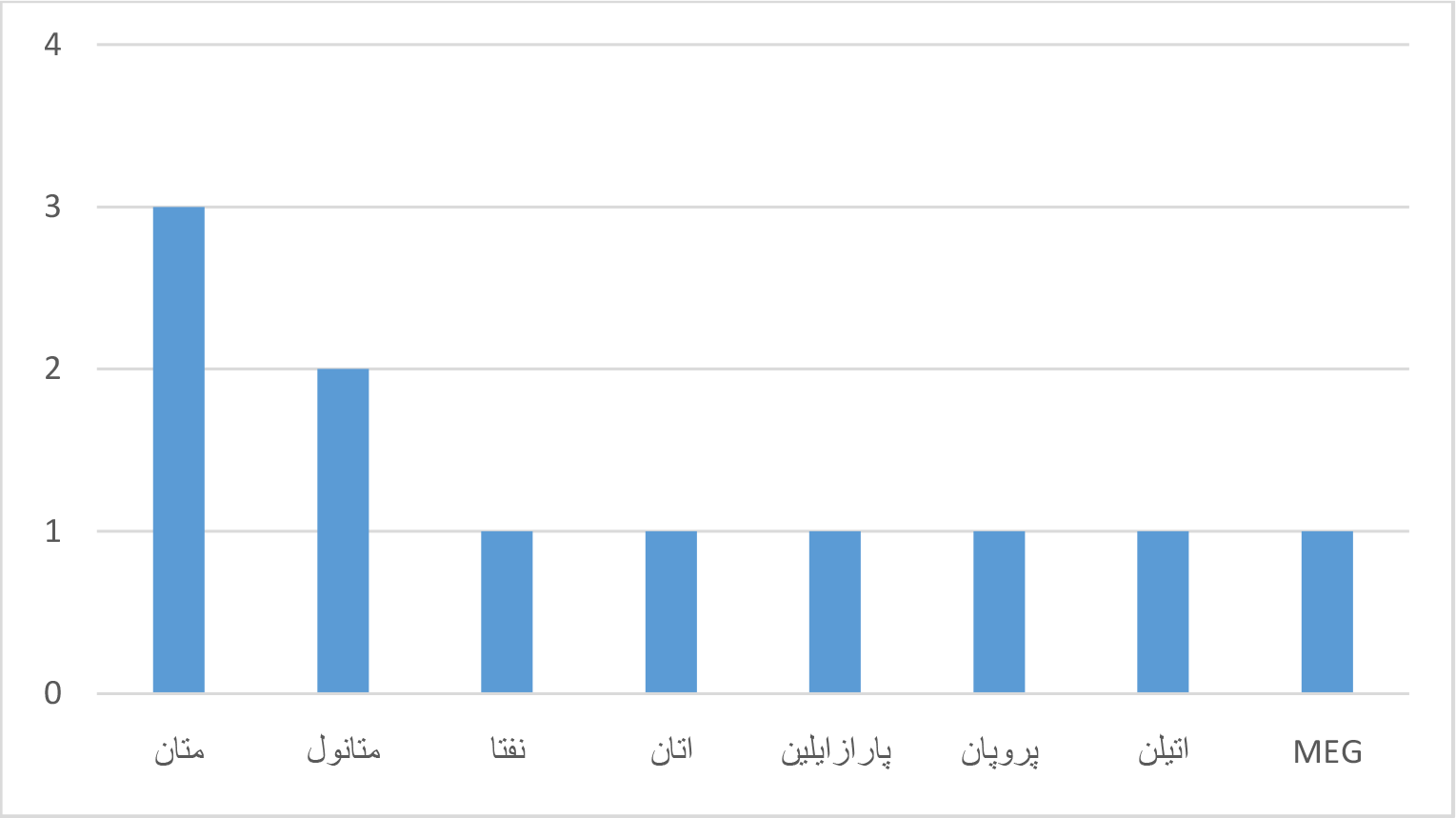 نمودار 10 تعداد طرحهایی که از هر یک از خوراکها استفاده میکنند مشخص شده است. همانطور که مشخص است سه طرح از متان، دو طرح از متانول و از نفتا، اتان، پارازایلین، پروپان، اتیلن و MEGهر یک در یک طرح استفاده شده است.