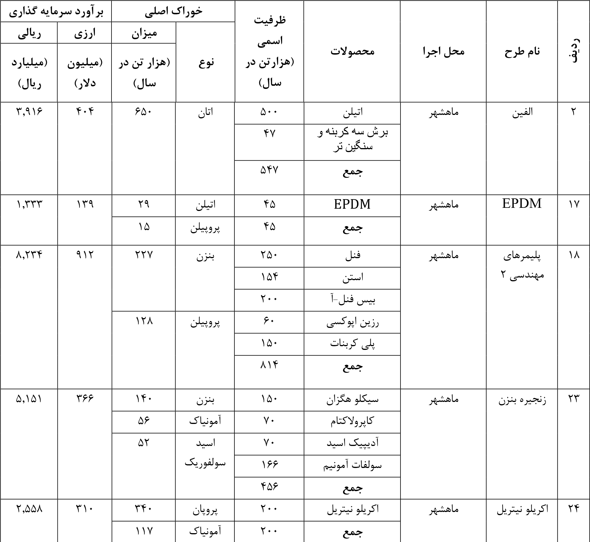 | ردیف | نام طرح | محل اجرا | محصولات | ظرفیت اسمی (هزارتن در سال) | خوراک اصلی | برآورد سرمایه گذاری |