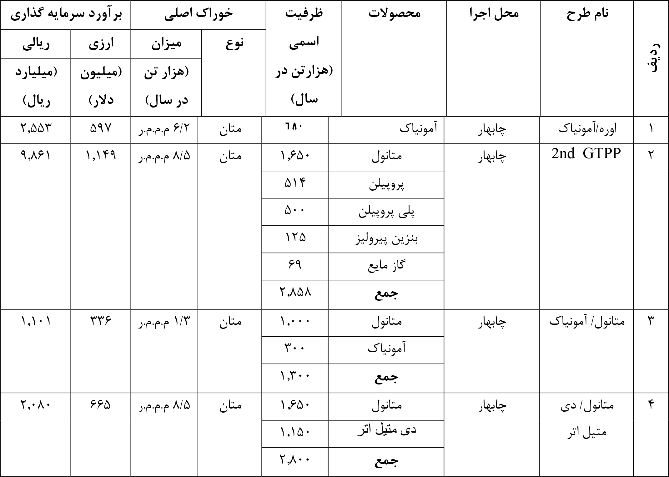 | 1 | اوره/آمونیاک | چابهار | آمونیاک | 680 | متان | 2/6 م.م.م.ر | 597 | 2,553 |