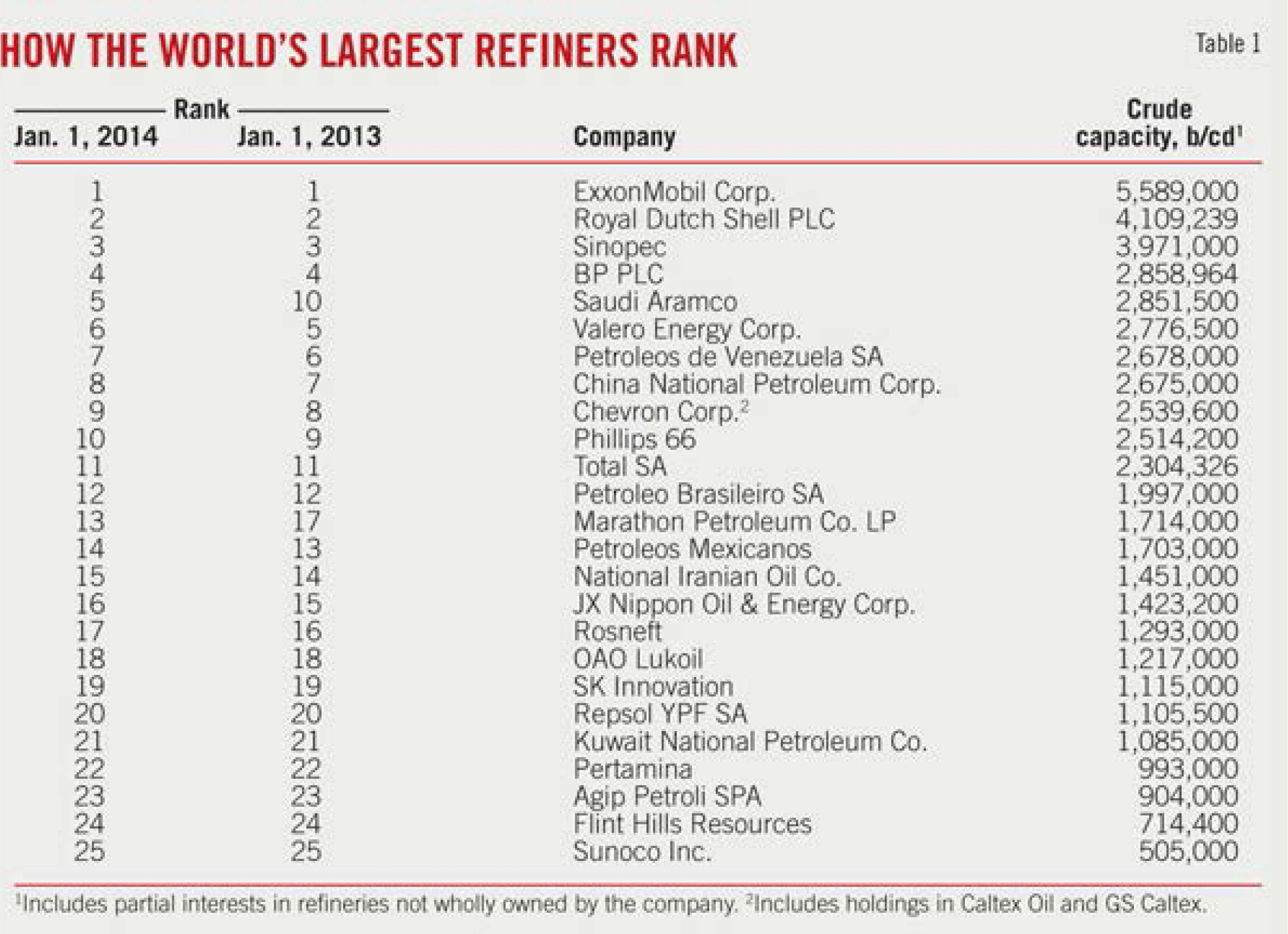 جدول یک - از شرکت های اصلی صنعت پالایش جهان