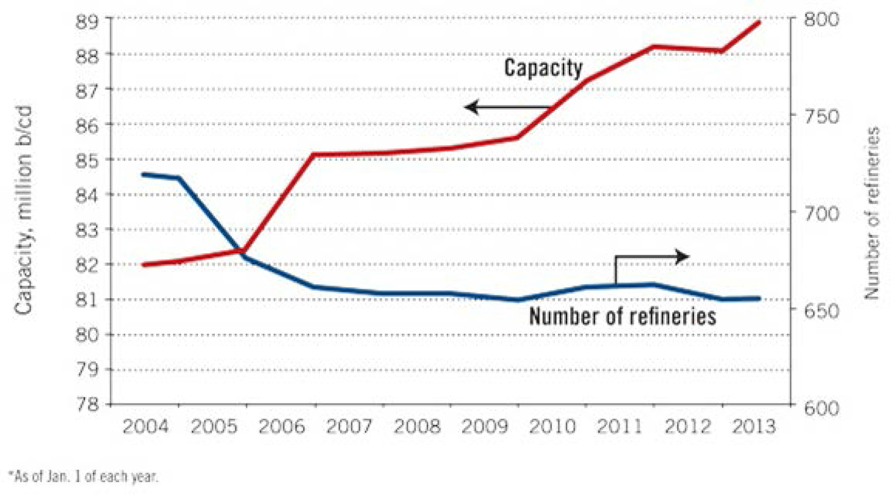 نمودار یک-ظرفیت پالایشی و تعداد پالایشگاه های فعال جهان