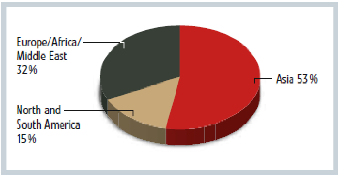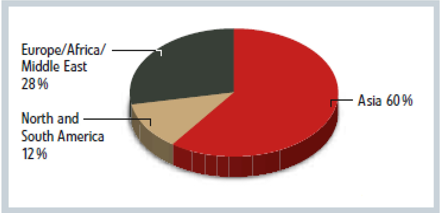 مصرف PBT در سال 2012 در حدود 830 هزار تن بوده که پراکندگی آن به شکل زیر میباشد:
