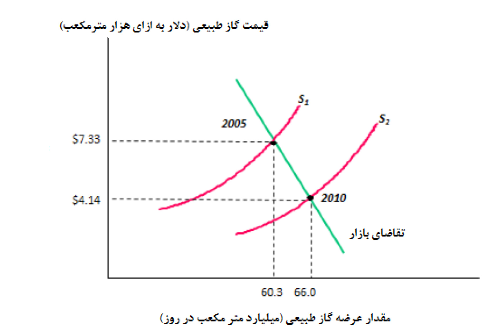 نمودار 1- تولید گاز شیل بیشتر منجر به افزایش عرضه گاز طبیعی با قیمت پایین‌تر می‌شود