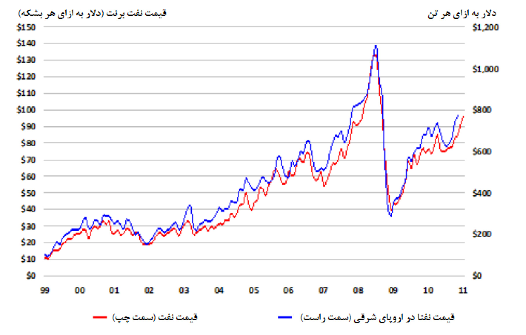 نمودار 2-  وابستگی مثبت بسیار قوی بین قیمت نفت و قیمت نفتا در اروپای شرقی