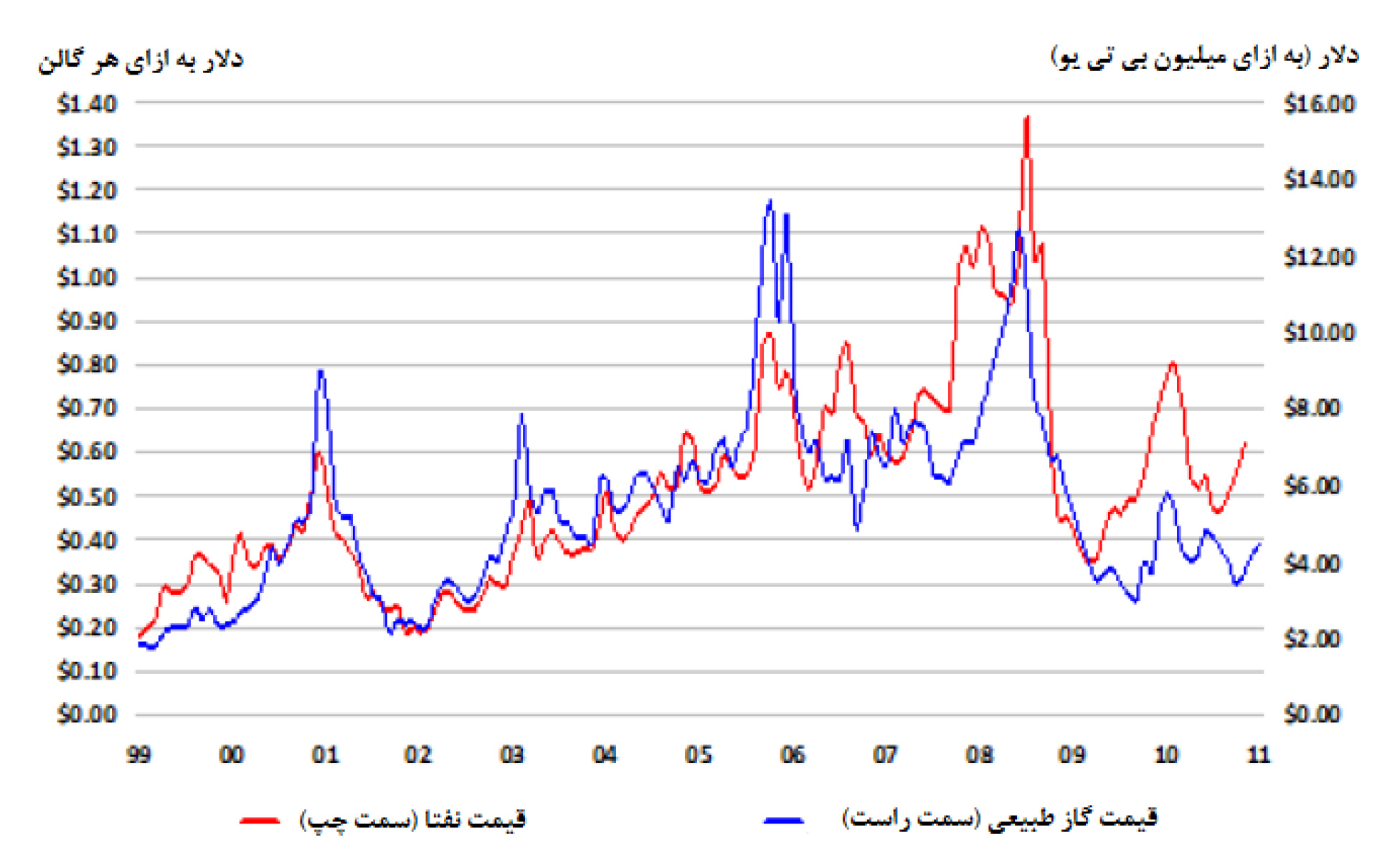 نمودار 3- وابستگی مثبت بین قیمت اتان و گاز طبیعی در آمریکا