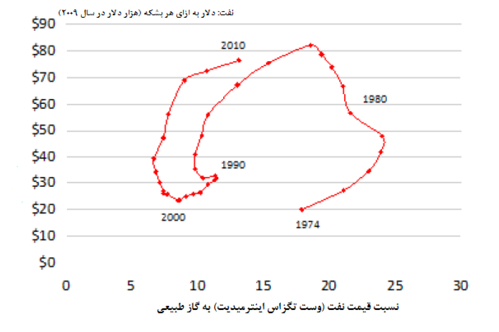 نمودار 4 تغییر دینامیک گاز طبیعی نسبت به نفت خام را در یک چشم‌انداز نسبتا طولانی ترسیم می‌کتد. این نمودار قیمت واقعی نفت (بر اساس قیمت‌های ثابت سال 2009) را در مقایسه با نسبت نفت به گاز در طول سال‌های 1974 و 2010 نشان می‌دهد. میانگین متحرک پنج‌ساله برای توضیح بهتر این روندها مورد استفاده قرار گرفته‌اند. زمانی که نسبت نفت به گاز بسیار بالاست، صنایع تولید محصولات پتروشیمی منتفع می‌شوند، همانگونه که این اتفاق برای صنایع پتروشیمی آمریکا در بین سال‌های 1974 تا اواخر دهه 1990 رخ داد. اما با تقویت تقاضای گاز طبیعی و محدودیت‌های عرضه، این وضعیت در دهه اخیر خیلی بدتر شد. علاوه بر این، قیمت واقعی نفت در طول 10 سال گذشته (تا سال 2014) افزایش یافته و منجر به ایجاد مزیت به دلیل فراوانی منابع گاز طبیعی (به خصوص در منطقه خاور میانه) شد. با کشف گاز شیل، موقعیت رقابتی صنعت پتروشیمی آمریکا بار دیگر دچار تحول شد و به وضعیت دهه 1980 برگشت، زمانی که قیمت نفت نسبت به گاز طبیعی بسیار بالاتر بود.
