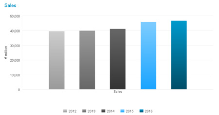 نمودار 1- میزان فروش شرکت بایر در سال های 2012 تا 2016 (میلیون یورو)