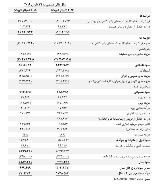 جدول 2- صورت سود و زیان شرکت نفت کویت برای سال مالی منتهی به 31 مارس 2016