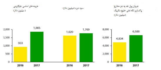نمودار 3- هزینه های اساسی، سود دوره و جریان پول نقد شرکت بی. پی. (مقایسه سال های 2016 و 2017)