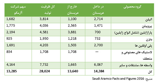 جدول 3- ظرفیت تولید محصولات پتروشیمی و شیمیایی در شرکت آرامکو عربستان (تن در سال)