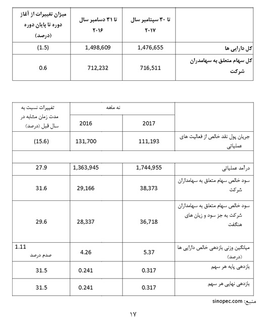 جدول 5- شاخص ها و داده های مالی اصلی شرکت سینوپک بر اساس گزارش مالی برای سال مالی منتهی به 30 سپتامبر 2017 (میلیون یوان)