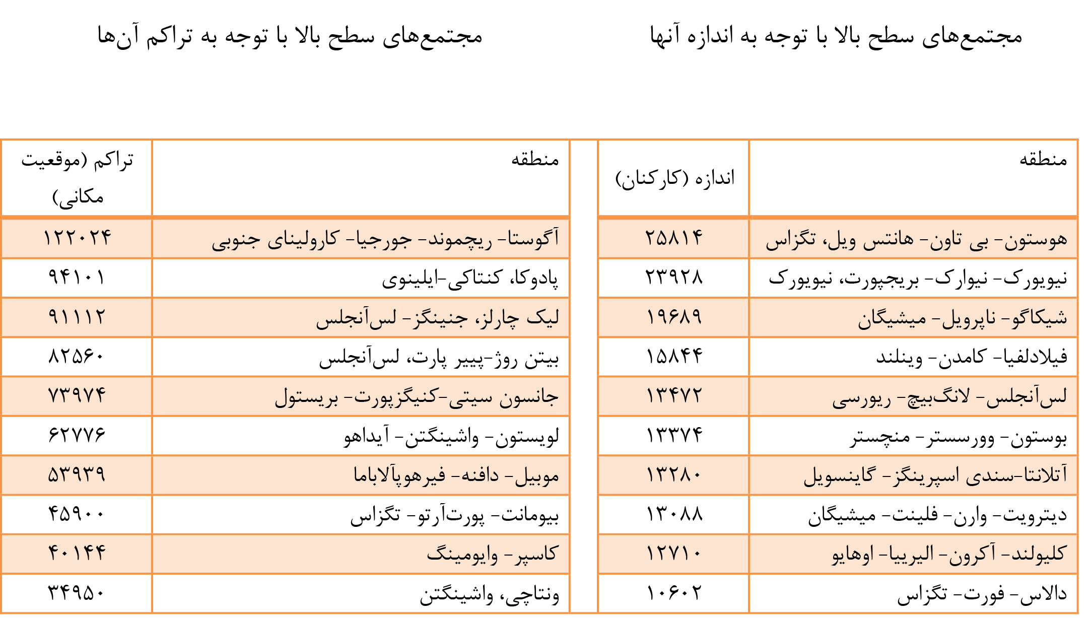 با مقایسه مجتمعهای پتروشیمی واقع در اروپا و ایالات متحده آمریکا -البته مقایسه مستقیم مجتمعهای واقع در اروپا و آمریکا مشکل آفرین است- به این نکته پی میبریم که اندازه کلان منطقههای شهری در کشور آمریکاناهمگون بوده و از مبادلات اقتصادی بیشتری برخوردار هستند، درحالیکه طبقهبندیواحدهای سرزمینی برای آمار[6] در اروپا دارای اندازه متجانستری بوده و از سرحدهای دولتی پیروی میکنند- چنین دادههایی بیان میکنند که: