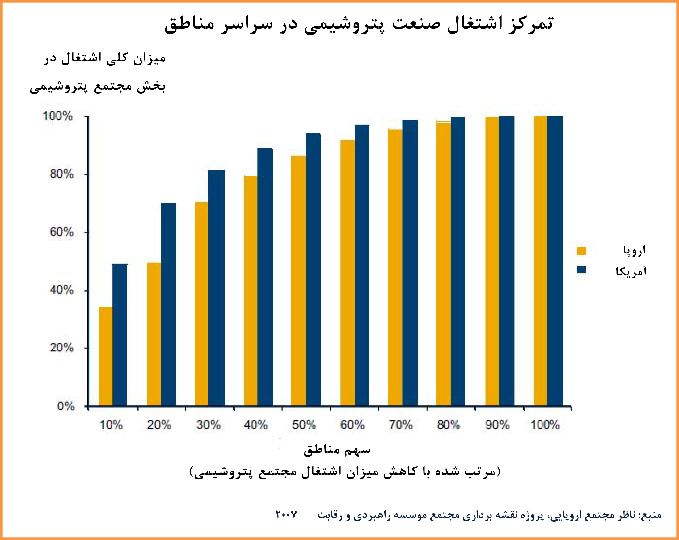 به نظر میرسد که تفاوت تمرکز اشتغال میان کشور آمریکا و اروپا در مجتمع پتروشیمی بهطور کلی به دلیل تفاوت در توزیع مناطق است. اندازه مناطق ایالات متحده آمریکا ناهمگونتر از اندازه مناطق واقع در اروپا است. 10 درصد از مناطق آمریکا که دارای بالاترین میزان اشتغال در بخش مبادلات محصولات هستند،50 درصد کل اشتغال این کشور را در بخش مبادلات محصولات رقم میزنند. این میزان برای اروپا 24 درصد است. میزان اشتغال در مجتمع پتروشیمی آمریکا، نسبت به اندازه توزیع مناطق، تراکم نسبتا کمتری را در مقایسه با اشتغال در بخش مبادلات محصولات دارد، درحالیکه در اروپا میزان اشتغال از تراکم قابل ملاحظهای برخوردار است. صنایع پتروشیمی اروپا به طور موثر در برطرف کردن چالشهای مرتبط با واگرایی اقتصادی موفق بودهاند.
