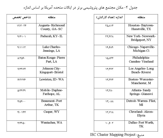جدول 2 مجتمع های پتروشیمی برتر را بر اساس اندازه و تخصص فهرست کرده است.