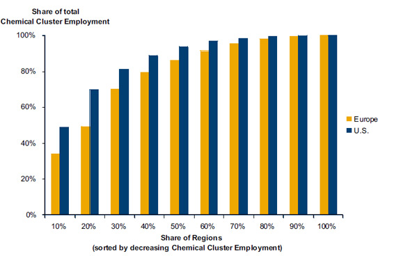 این تجزیه و تحلیل بدین معنی است که تفاوت در تمرکز اشتغال بین ایالات متحده آمریکا و اروپا در مجتمع پتروشیمی به طور کامل به دلیل اختلافاتی است که در اندازه توزیع مناطق وجود دارد. مناطق ایالات متحده آمریکا از نظر اندازه بسیار غیر برابرتر از مناطق اروپایی هستند. حدود 10 درصد از مناطق ایالات متحده آمریکا با بالاترین سطوح اشتغال ایجاد شده در بخش تجاری در حدود 50 درصد از کل اشتغال بخش تجاری آمریکا را تشکیل می دهند. این رقم برای اروپا در حدود 24 درصد است. نسبت به اندازه توزیع مناطق، میزان اشتغال ایجاد شده در مجتمع های پتروشیمی در ایالات متحده آمریکا اندکی کمتر از اشتغال ایجاد شده در بخش تجاری به صورت کلی است، در حالی که در اروپا میزان تمرکز بسیار بیشتر است. صنایع پتروشیمی اروپا تا حد بسیار زیادی قادر به غلبه بر چالش های هستند که به طور کلی بر سر اقتصاد سایه افکنده اند.