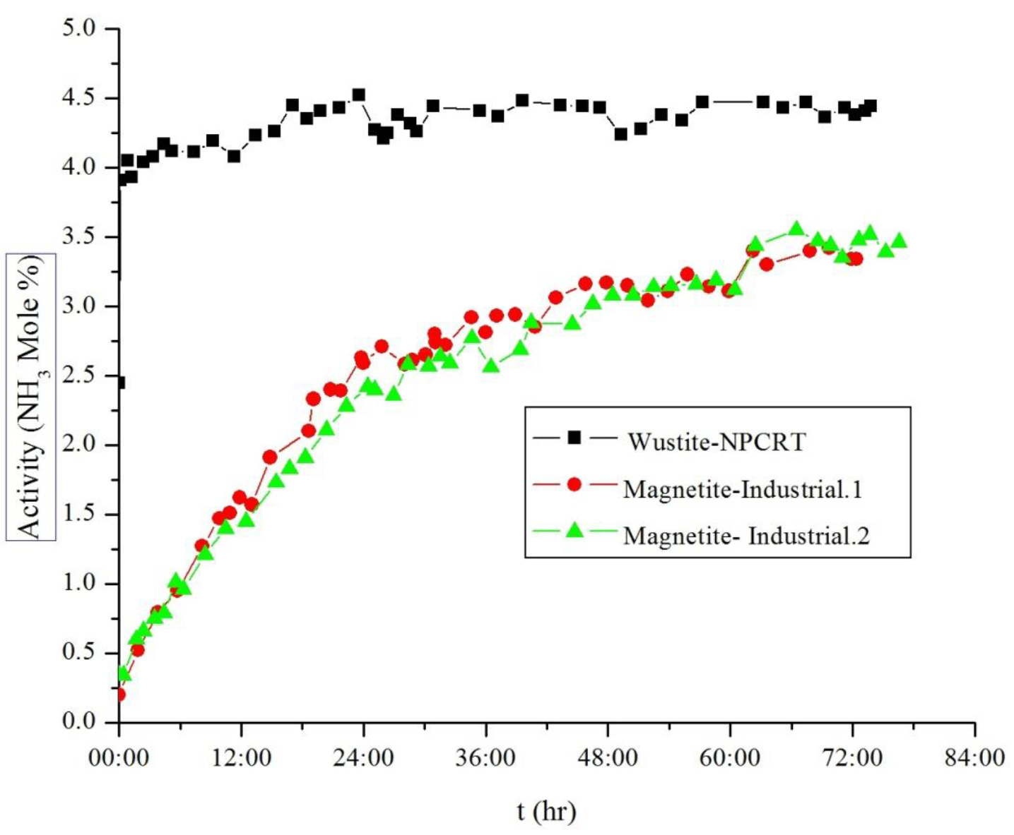 نتایج آزمونهای راکتوری نشان میدهد که کاتالیست وستیت نسبت به کاتالیست مگنتیت خیلی سریعتر فعال میشود و فعالیت بالاتری نسبت به نمونه مگنتیت دارد. (شکل 2).