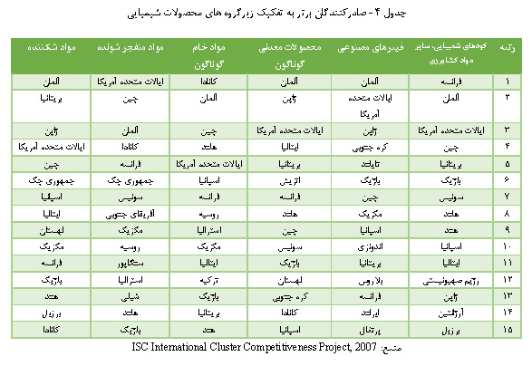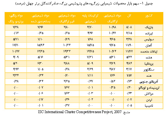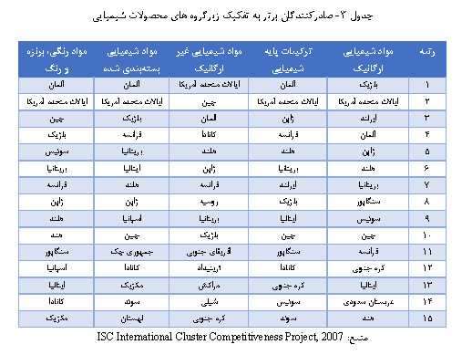 جدول 1 فهرست مجتمع های پتروشیمی زیرگروه بزرگ که صادرکنندگان برتر محصولات شیمیایی هستند را از نظر سهم بازار آنها نشان می دهد و جدول 2 همین فهرست را در مورد مجتمع های پتروشیمی زیر گروه کوچک فقط در مورد کودهای شیمیایی (فرانسه) و انواع مواد نفتی (کانادا) کشورهای دیگر در جایگاه برتر قرار دارند.