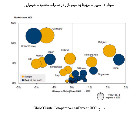 در مقابل در همین دوره زمانی چین و سنگاپور جایگاه های بهتری پیدا کرده اند. بهبود جایگاه چین حتی بسیار سریعتر اتفاق افتاده است، در حالی که سنگاپور از سال 2003 به بعد تا حدی جایگاهش تنزل یافته است. بلژیک و هلند نیز توانسته اند به طور چشمگیری سهم بازار خود را در صادرات محصولات شیمیایی بهبود بخشند. نمودار 1 تغییرات مربوط به سهم بازار کشورهای مختلف را در مناطق مختلف دنیا نشان داده است.