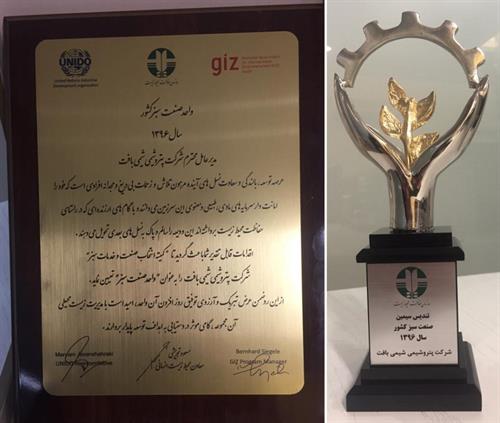 به گزارش نیپنا به نقل از روابط عمومی پتروشیمی شیمی بافت، درآئین بیستمین جایزه ملی صنعت سبز کشور که صبح دیروز (سه شنبه ۲ بهمن ماه) با حضور دکتر کلانتری معاون رئیس جمهور و رئیس سازمان حفاظت محیط زیست درسالن همایش های بین المللی سازمان حفاظت محیط زیست برگزار شد، شرکت شیمی بافت موفق به دریافت این جایزه شد.