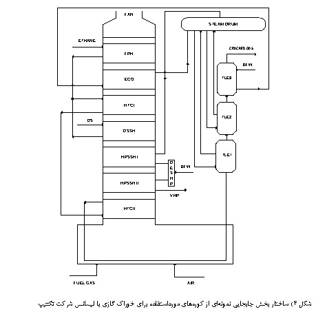 در کورههای اولیه موجود در ایران (پتروشیمی آبادان) از حرارت گازهای احتراق در بخش جابجایی تنها برای پیشگرمایش مخلوط جریان خوراک و بخار رقیقکننده استفاده میشود و گازهای احتراق با دمای نسبتاً بالایی (1000 -800 درجه فارنهایت) از دودکش کورهها به اتمسفر تخلیه میشوند. در بخش جابجایی این کورهها بخار فوقاشباع با دما و فشار بالا تولید نمیشود هم چنین به جای استفاده از مبدلهای خط انتقال جهت بازیافت حرارت از محصول خروجی از کورهها از Quench pot استفاده میشود که برای کاهش سریع دمای محصول، آب به صورت مستقیم به محصول خروجی اسپری میشود در نتیجه بازده حرارتی این کورهها پایین است % (70-60). شکل 3 ساختار نمونهای از این کورهها را نشان میدهد. در کورههای جدید (تکنولوژیهای لینده و تکنیپ) از پتانسیل حرارتی دو منبع حرارتی موجود (گازهای ناشی از احتراق کوره و محصول خروجی از کوره) بیشترین بازیافت و استفاده ممکن صورت میگیرد در همین راستا از حرارت گازهای ناشی از احتراق کوره برای تولید بخار فوقاشباع و همچنین پیشگرمایش خوراک و بخار رقیقکننده و از حرارت محصول خروجی از کوره (گاز شکست) برای تولید بخار اشباع از مایع اشیاع در مبدلهای خط انتقال استفاده میشود این موضوع باعث افزایش قابل توجه راندمان و بهرهوری انرژی در این کورهها میشود طوری که راندمان حرارتی این کورهها در گستره حدود % (95-90) میباشد. شکل 4 ساختار بخش جابجایی نمونهای از این کورهها با خوراک گازی (اتان) را نشان میدهد این بخش به ترتیب از بالا به پایین شامل کویلهای زیر میباشد: