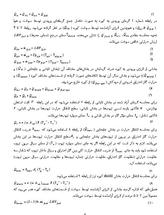 بازیافت حرارت در بخش جابجایی کورهها نقش مهمی در افزایش راندمان و بهرهوری انرژی در این تجهیزات مهم و حیاتی دارد. برای بررسی بازده حرارتی کوره و نقش بخش جابجایی در مقدار آن، ابتدا موازنه حرارتی مطابق روابط زیر برای کوره در نظر گرفته میشود ]2[: