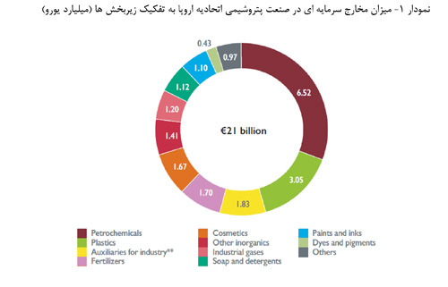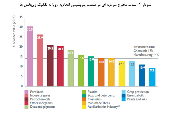 منبع: Eurostat SBS Data (2015) and Cefic analysis 2018/ * Eurostat code V1510- سرمایه گذاری ناخالص در کالاهای ملموس/ Eurostat Nace code 2059 و سایر محصولات پتروشیمی/ به جز مواردی که ذکر شده است صنعت پتروشیمی شامل صنعت تولید محصولات داروئی نمی شود/ به جز مواردی که ذکر شده است اتحادیه اروپا شامل 28 کشور این اتحادیه است.