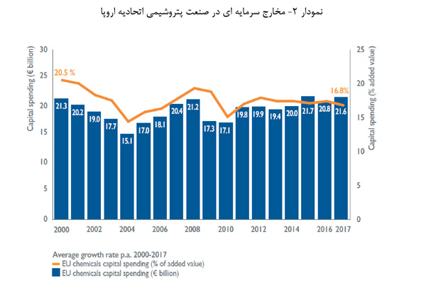 نمودار 2 به وضوح نشان می دهد که سرمایه گذاری (به شکل مطلق) در اتحادیه اروپا در حال افزایش بوده است. میزان سرمایه گذاری در صنعت پتروشیمی اتحادیه اروپا در سال 2017 به 21.6 میلیارد یورو رسید- ای نرقم بیشترین میزان سرمایه گذاری از سال 2000 تا کنون است.