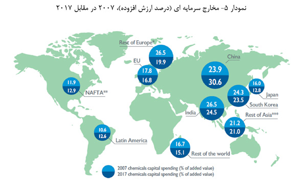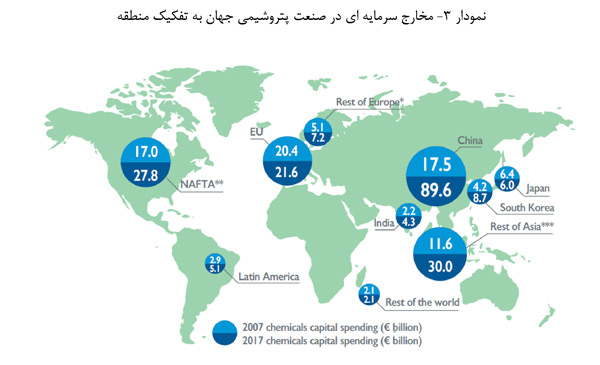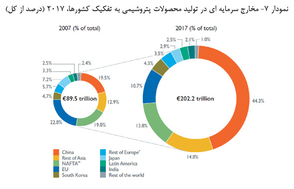 در سال 2017، چین تقریبا 30 درصد از کل سرمایه گذاری های صورت گرفته در صنعت پتروشیمی جهان را به خود اختصاص داد، این رقم در سال 2007 در حدود 9 درصد بود. مخارج سرمایه گذاری در اتحادیه اروپا با نرخ متوسط 2 درصد در فاصله سال های 2007 تا 2017 رشد کرد. اتحادیه اروپا در مقام دوم قرار دارد، و 22.1 درصد از کل سرمایه گذاری جهان را به خود اختصاص داده است. ایالات متحده آمریکا نیز با سهم 21.2 درصدی در جایگاه سوم قرار می گیرد، رقمی که نسبت به رقم 23.4 درصدی در سال 2007 کاهش یافته است.