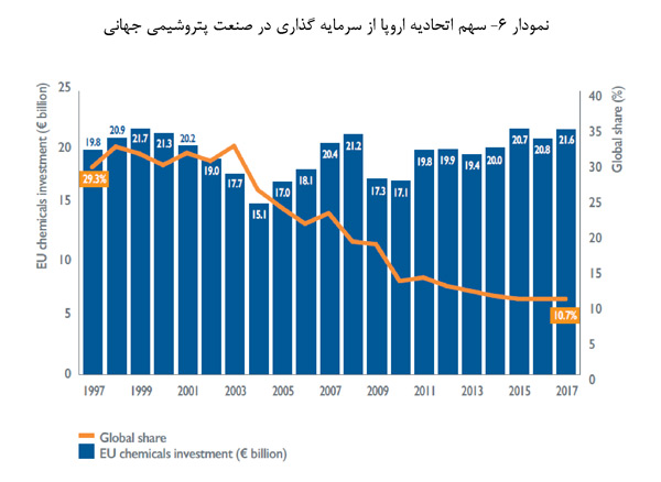 سهم اتحادیه اروپا از سرمایه گذاری در صنعت پتروشیمی جهانی