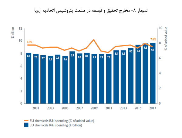 ارزش افزوده صنعت پتروشیمی اتحادیه اروپا در کل دوره 2000 تا 2017 رشد متوسطی بالغ بر 1.2 درصد داشته است. مخارج تحقیق و توسعه نیز با نرخ مشابهی یعنی 1.1 درصد رشد کرده است. در نتیجه شدت تحقیق و توسعه در سال 2017 ارزشی مشابه با سال 2007 داشته است.