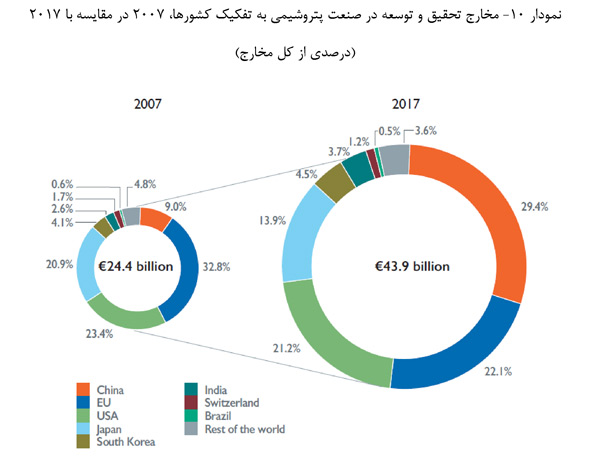 میزان مخارج تحقیق و توسعه در بخش پتروشیمی در جهان در سال 2017 به رقم 43.95 میلیارد یورو رسید، که این رقم نسبت به رقم 24.43 میلیارد یورو در سال 2007 رشد چشمگیری داشته است. در یک مقیاس جهانی، میزان مخارج تحقیق و توسعه 80 درصد بالاتر از ده سال قبل یعنی سال 2007 بود.