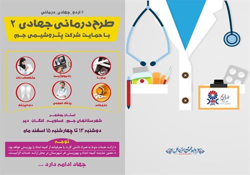 بر پایه این گزارش تیم پزشکی ویژه مددجویان شهرستان های جنوبی استان بوشهر، در محل شهرک خلیج فارس پتروشیمی جم واقع در شهرستان عسلویه استقرار می یابد. این تیم با ارائه خدمات پزشکی نظیر دندانپرشکی، زنان، مامایی، پزشک عمومی، سونوگرافی و مشاوره روانشناسی با شعار " جهاد ادامه دارد" این امر خدا پسندانه را اجرایی می کند.
