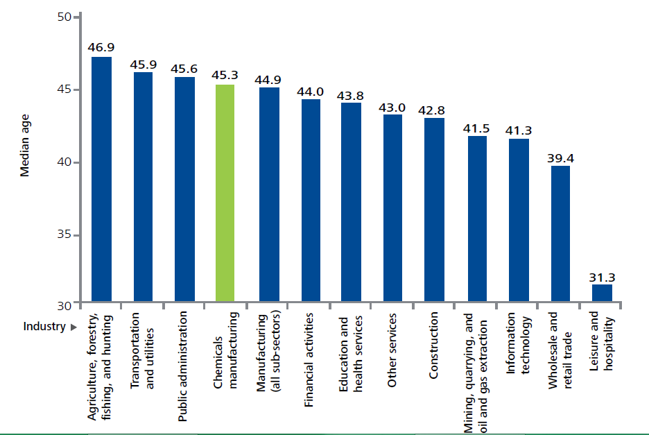 ایالات متحده آمریکا، به عنوانی یکی از مهم ترین بازارها در صنعت پتروشیمی جهان می تواند تصویر دقیقی از مشکل مربوط به استعدادها در صنعت پتروشیمی جهان را نشان دهد. در شرکت هایی که همه نوع محصول تولید می کنند، انتظار می رود که تعداد زیادی از کارمندان بازنشسته شوند. در واقع، در طول 10 سال آینده، 23 درصد از نیروی کار فعال در صنعت پتروشیمی می توانند بازنشسته شوند. به طور متوسط، نیروی کار فعال در صنعت پتروشیمی در مقایسه با سایر صنایع، به جز کشاروزی، حمل و نقل و مدیریت دولتی بسیار مسن تر هستند، که البته همه این صنایع در مقایسه با صنعت پتروشیمی بسیار کوچکتر هستند. این موضوع در نمودار 1 نشان داده شده است.