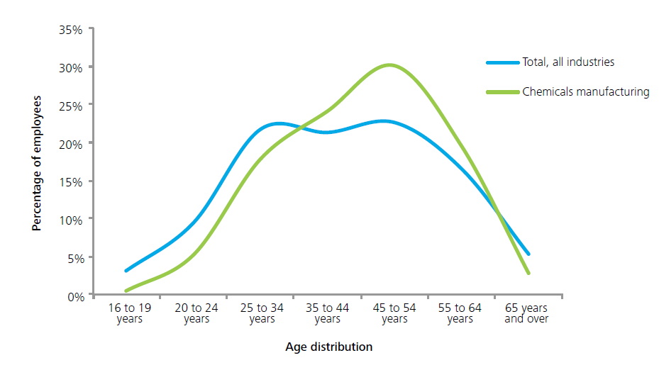 علاوه بر این که صنعت پتروشیمی میانه سنی بیشتری در مقایسه با سایر صنایع دارد، توزیع کلی سن در این صنعت نیز به سمت سالخوردگی چولگی دارد. در بسیاری از صنایع، توزیع سنی نیروی کار به شکل زنگوله است. این بدان مفهوم است که در حالی که درصد عمده ای از نیروی کار مسن هستند، نیروی کار جوان نیز در صنعت مشغول به کار است به طوری که پس از بازنشستگی افراد مسن آنها می توانند به راحتی جای آنها را پر کنند.