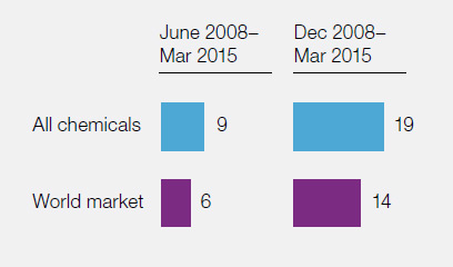 محصولات و کالاهای تخصصی تولیدی در طول 15 سال گذشته توانسته اند با فریبکاری بالاترین میزان بازدهی کل سهامداران را به خود اختصاص دهند، البته این بستگی به دوره زمانی مورد بررسی نیز دارد. در طول سه سال گذشته، محصولات شیمیایی تخصصی به لحاظ میزان بازدهی کل سهامداران بالاترین رقم را در بین سایر محصولات به خود اختصاص داده اند (نمودارهای 4 و 5). دلیل عمده چنین اتفاقی این است که بهبود نسبتا قوی در بازدهی سرمایه ایجاد شده است.